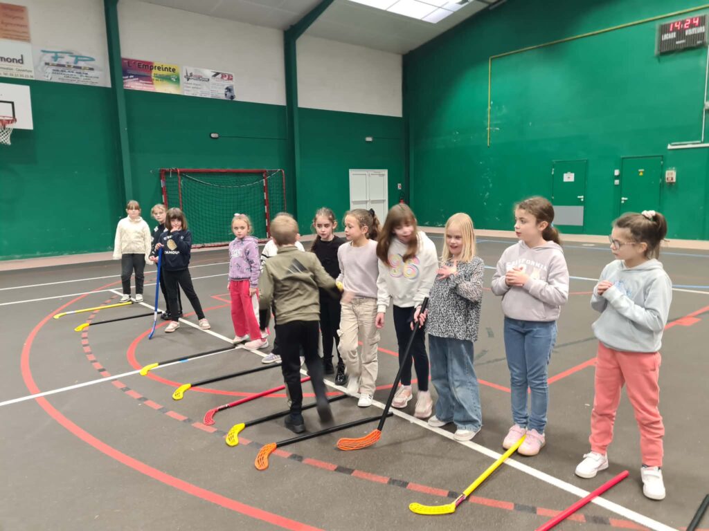 Hockey en salle : nous découvrons le hockey en salle avec la crosse et la balle, nous slalomons et faisons le jeu du béret.