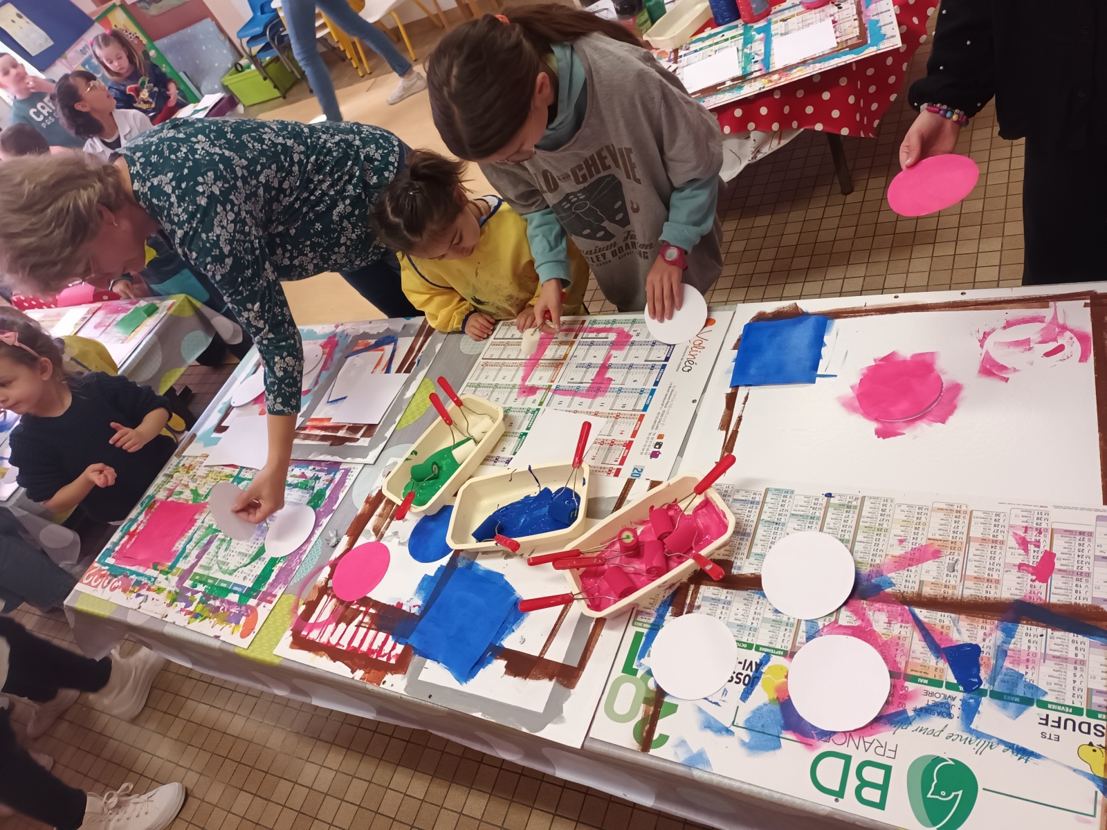 Pour fêter le centième jour d’école, les TPS-PS et les CM2A se sont réunis pour un projet coloré : un tableau à la manière de Vasarely, composé de 100 carrés et 100 cercles !