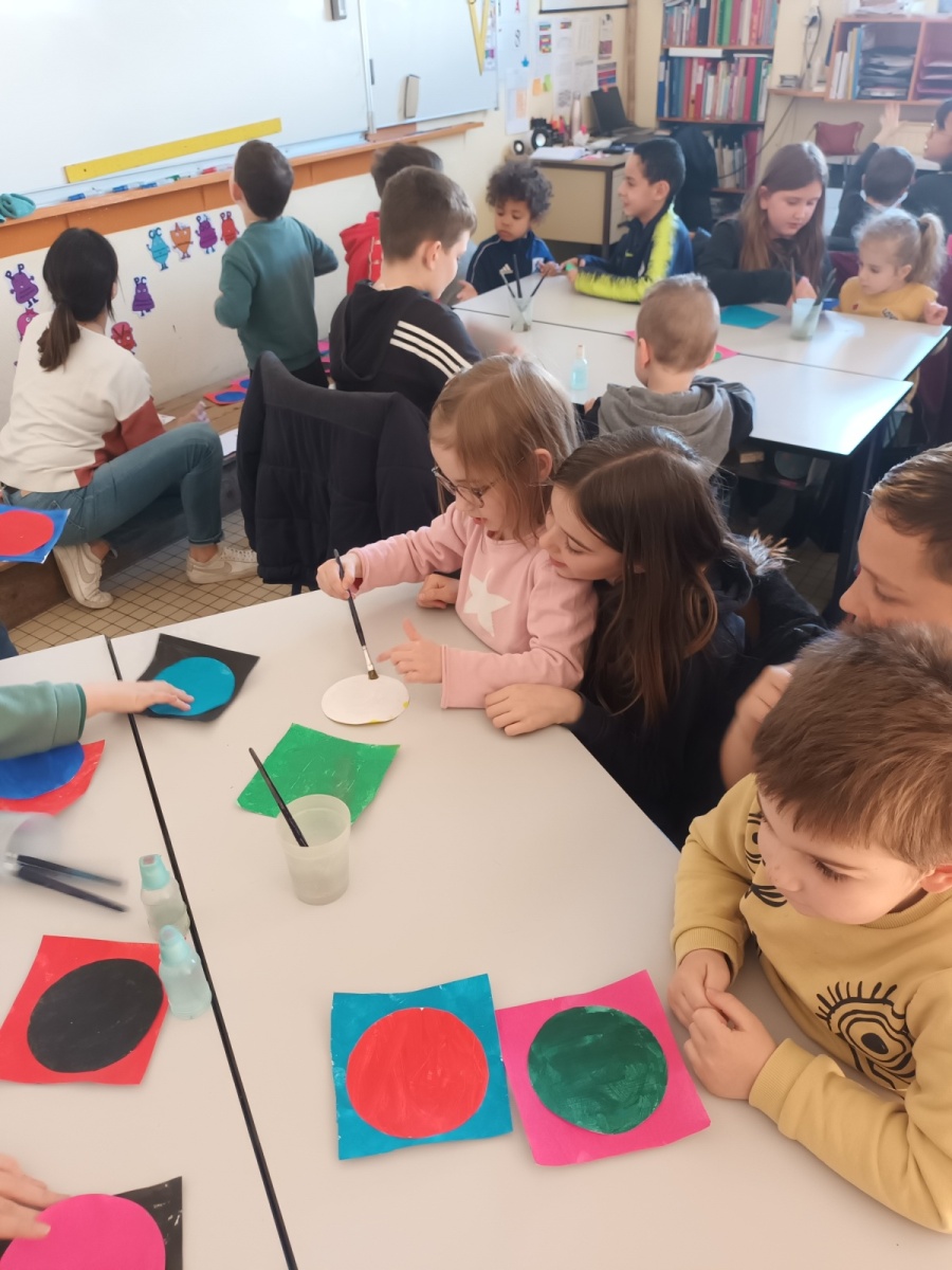 Pour fêter le centième jour d’école, les TPS-PS et les CM2A se sont réunis pour un projet coloré : un tableau à la manière de Vasarely, composé de 100 carrés et 100 cercles !