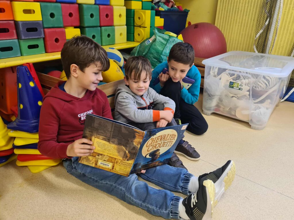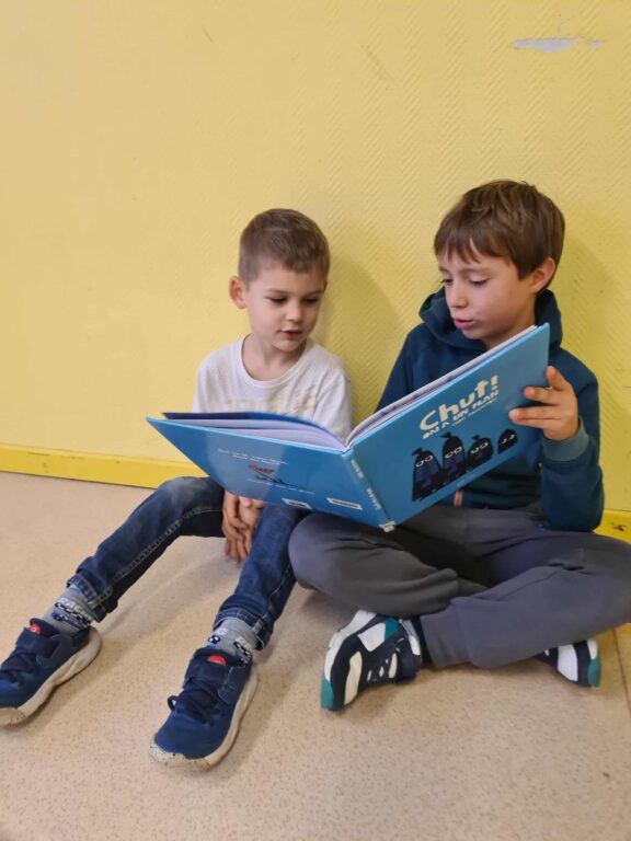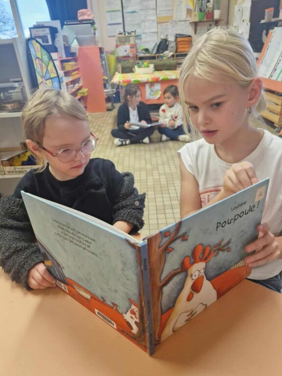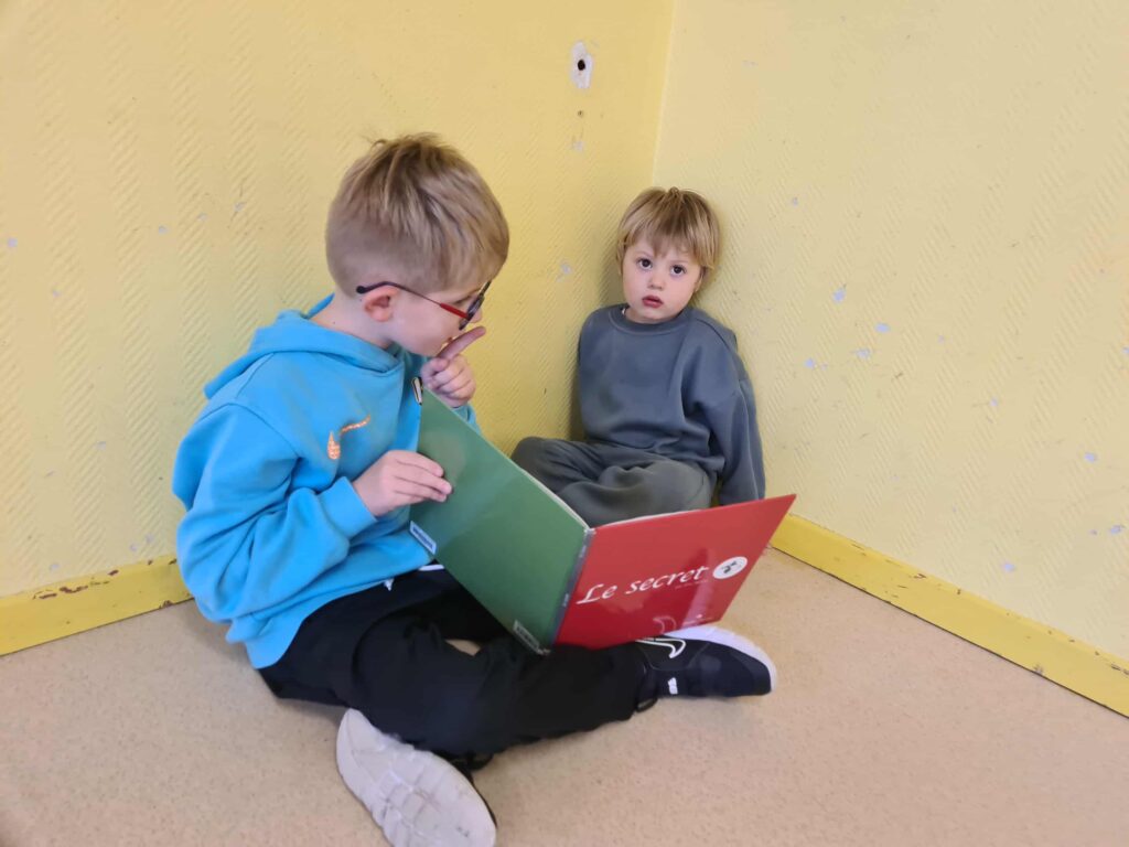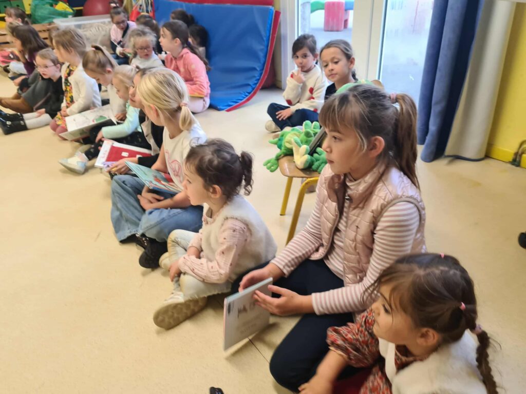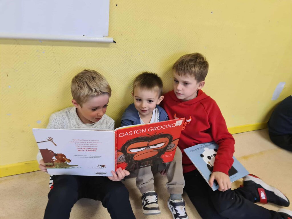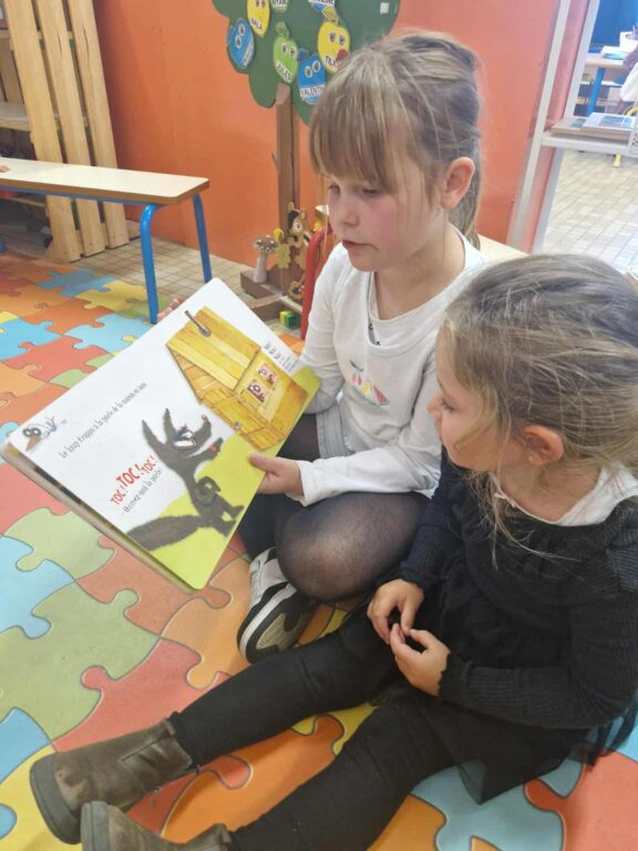 Jeudi 13 novembre, les élèves de MS et de CE2 se sont retrouvés dans la salle de motricité afin d’échanger un temps de lecture. Solène, de la bibliothèque de Soullans,  nous avait sélectionné un choix de livres adaptés. Puis en classe, les CE2 se sont entraînés à lire leur livre à voix haute, en mettant le ton, en articulant et en lisant doucement. Bien montrer l’illustration du livre également.Donner envie d’écouter et de savoir la suite… développer le suspens. Les élèves se sont ensuite répartis en 2 groupes dans la classe de Françoise et dans la salle de motricité pour ce temps de lecture : magique ! Un temps apprécié par les petits comme les grands… les CE2 se souviennent que lorsqu’ils étaient en MS, les CE2 leur lisaient des histoires. Maintenant à leur tour de transmettre aux plus petits.