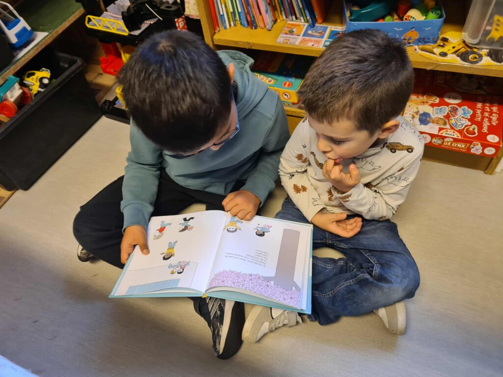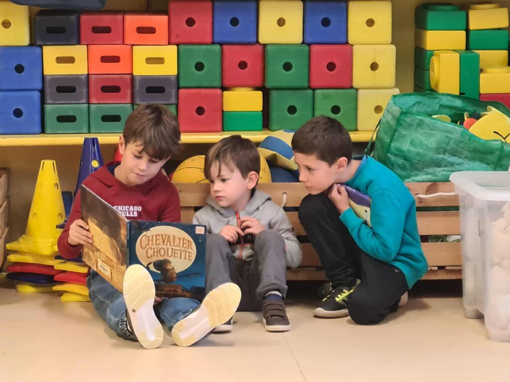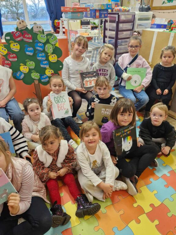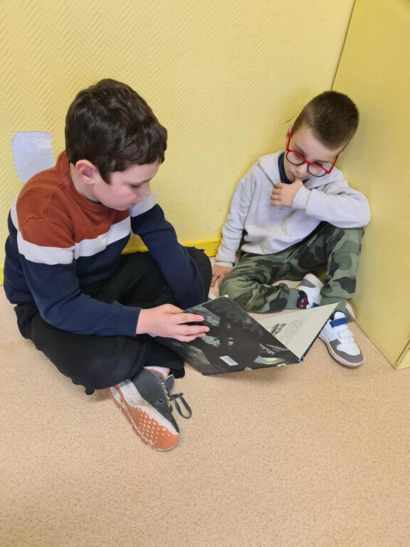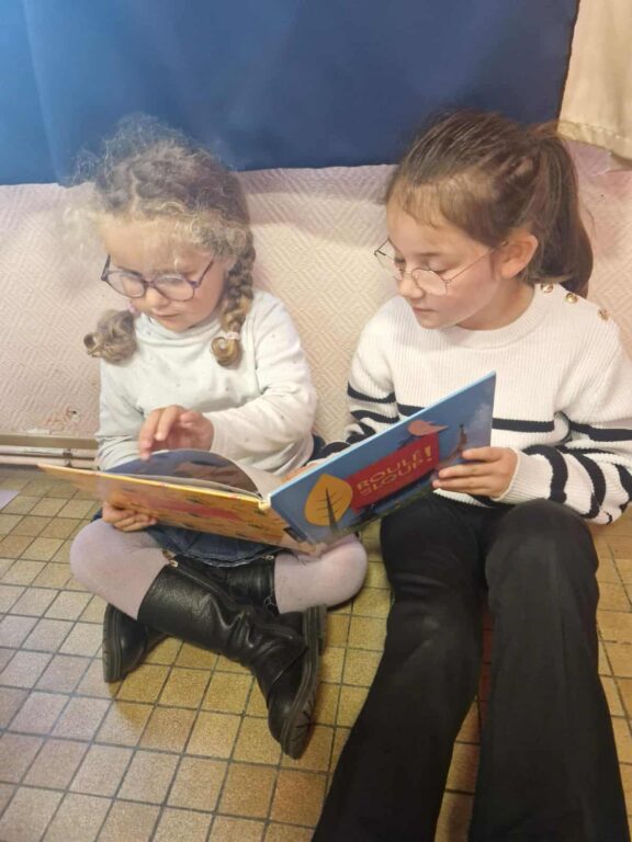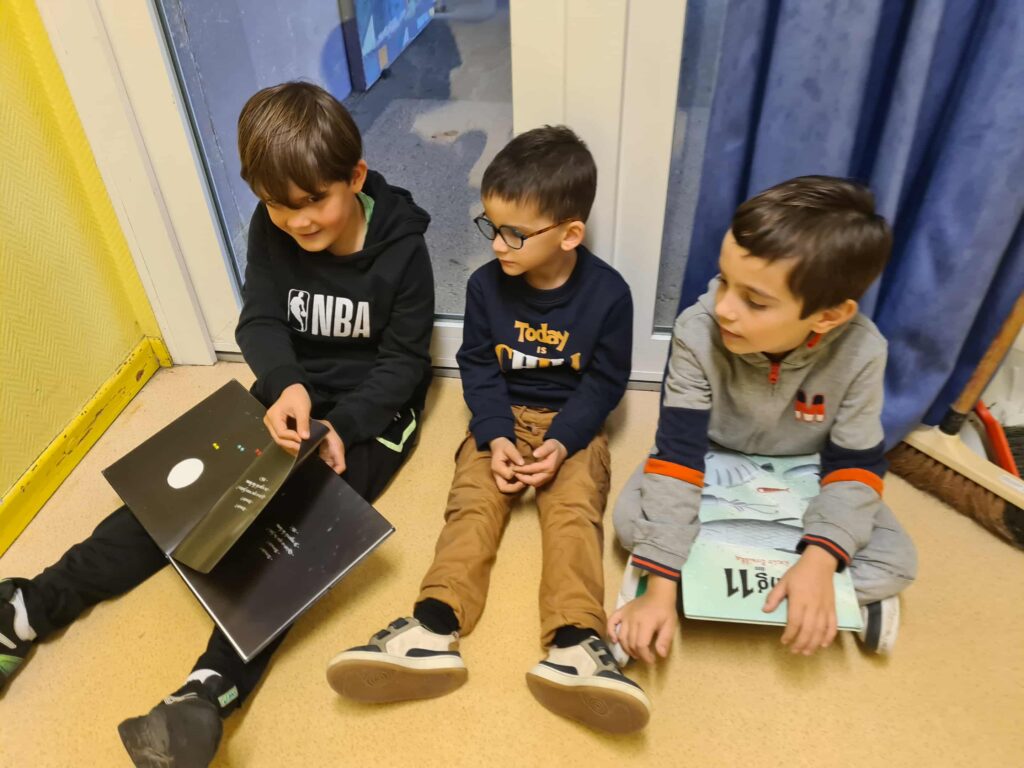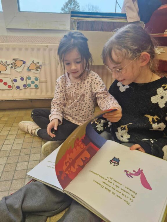 Jeudi 13 novembre, les élèves de MS et de CE2 se sont retrouvés dans la salle de motricité afin d’échanger un temps de lecture. Solène, de la bibliothèque de Soullans,  nous avait sélectionné un choix de livres adaptés. Puis en classe, les CE2 se sont entraînés à lire leur livre à voix haute, en mettant le ton, en articulant et en lisant doucement. Bien montrer l’illustration du livre également.Donner envie d’écouter et de savoir la suite… développer le suspens. Les élèves se sont ensuite répartis en 2 groupes dans la classe de Françoise et dans la salle de motricité pour ce temps de lecture : magique ! Un temps apprécié par les petits comme les grands… les CE2 se souviennent que lorsqu’ils étaient en MS, les CE2 leur lisaient des histoires. Maintenant à leur tour de transmettre aux plus petits.