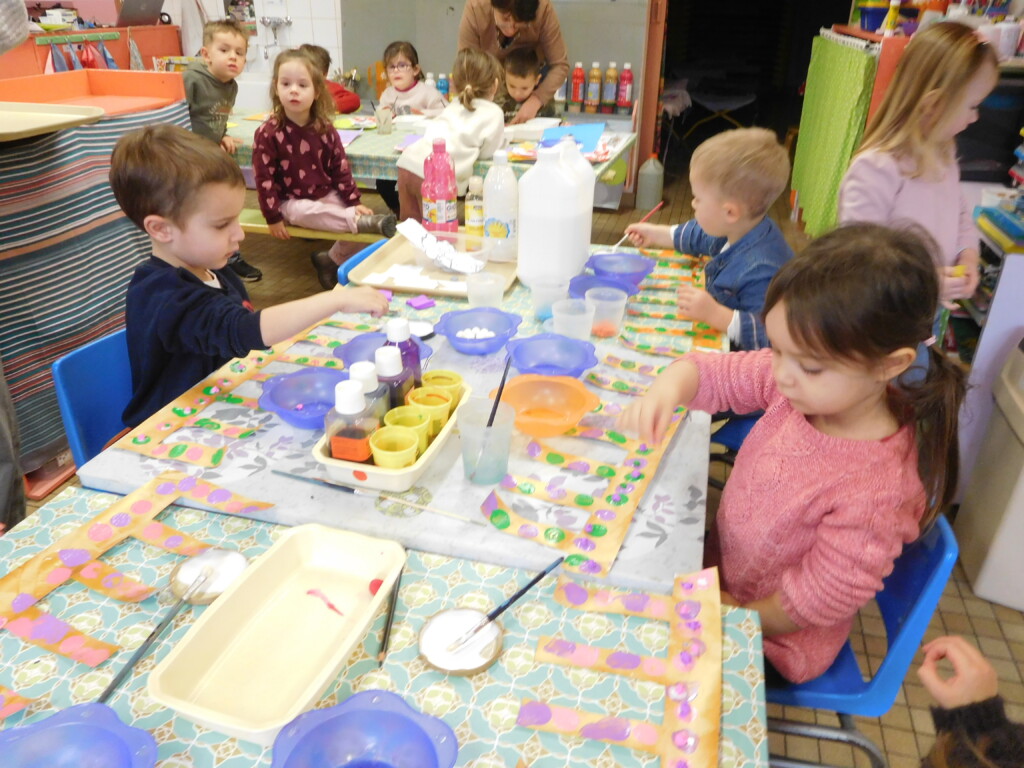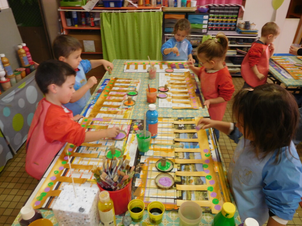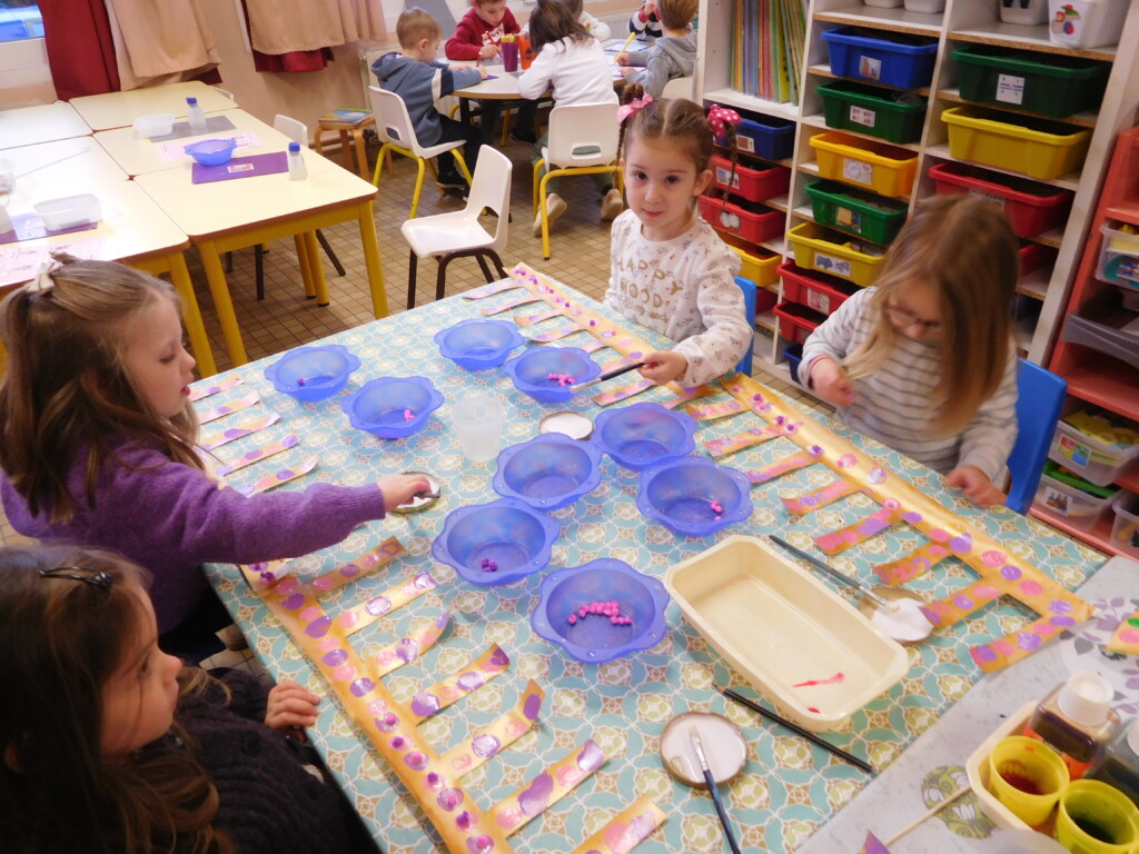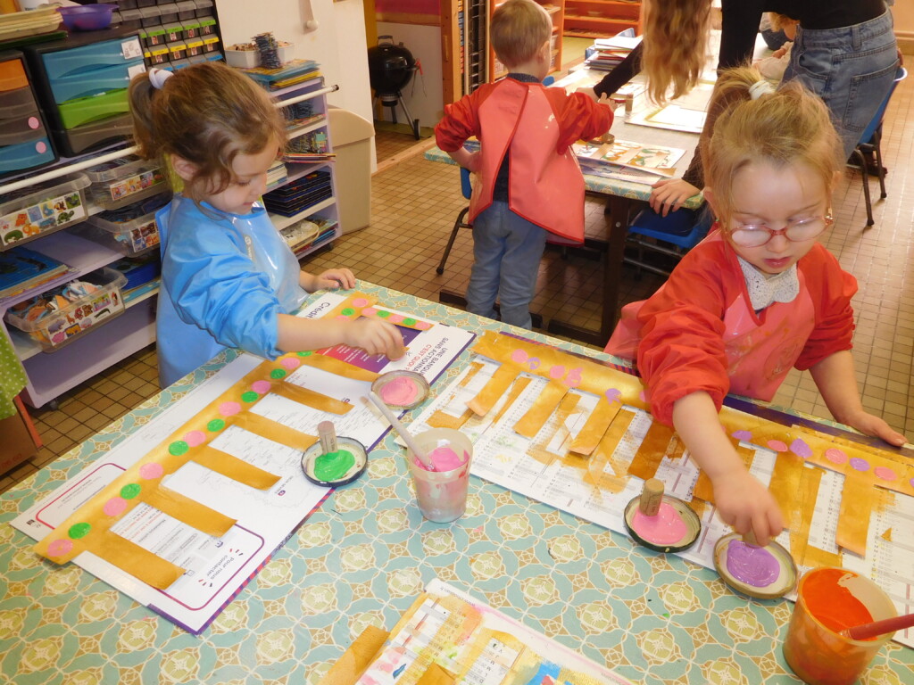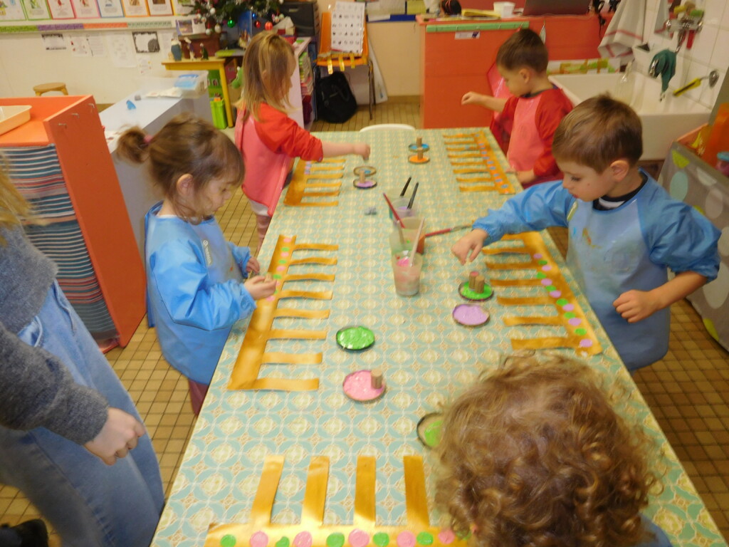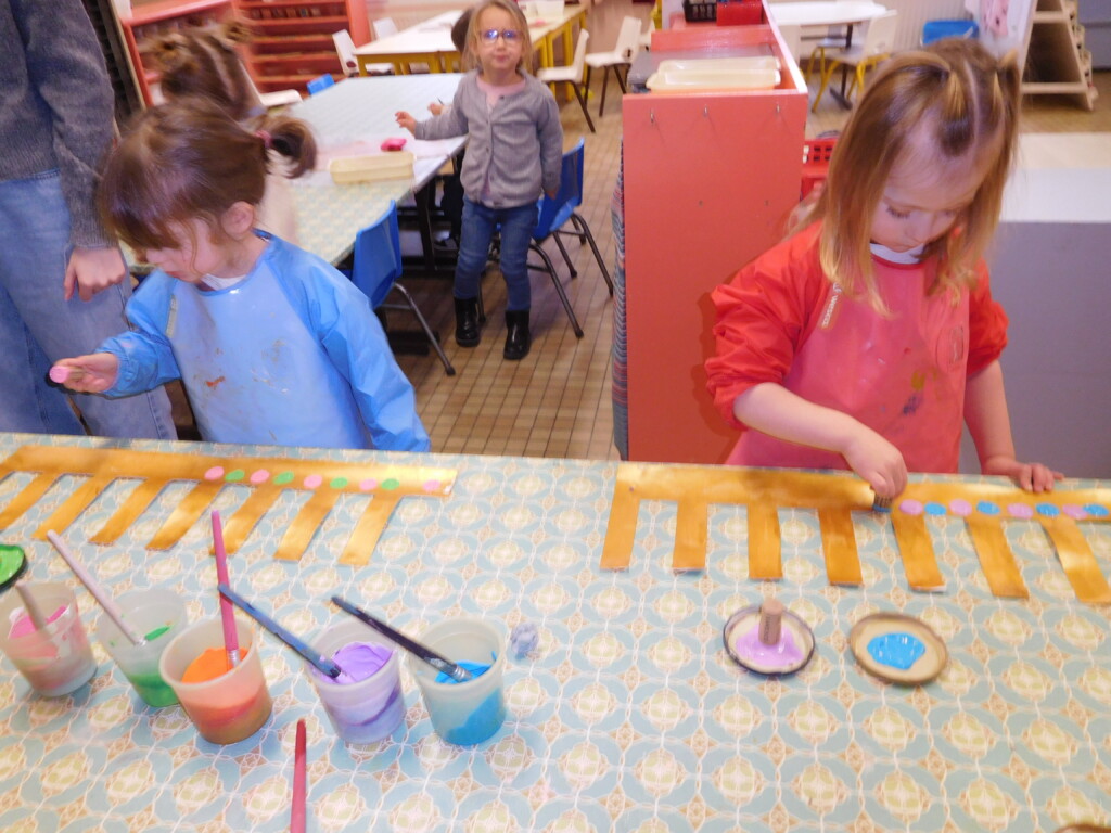 Alors nous avons peint des couronnes en papier au rouleau avec de la peinture dorée. Nous les avons agrémentées de points de algorithme faits avec des empreintes de bouchon dans de la peinture. Puis nous avons collé des “pierres précieuses” en papier crépon.