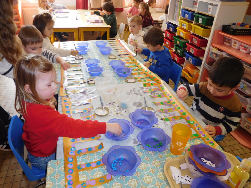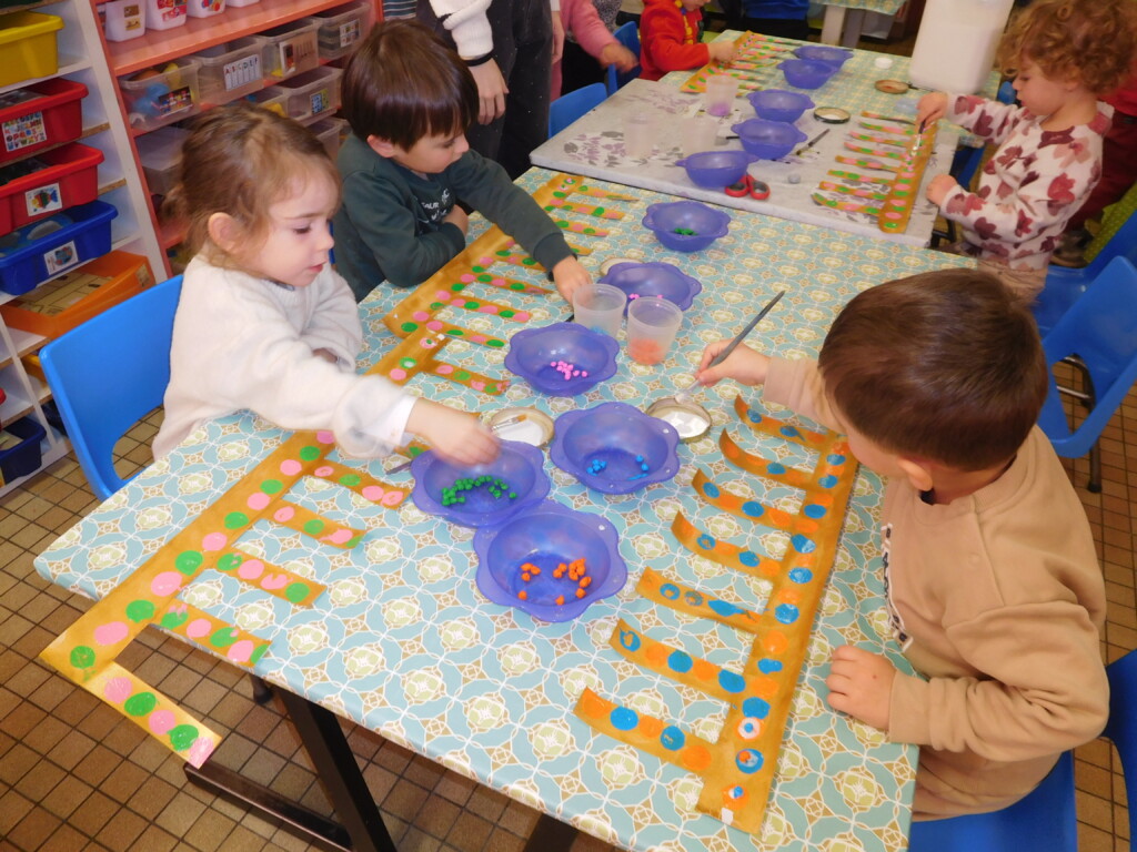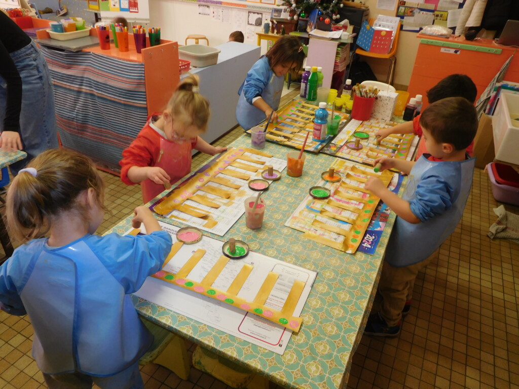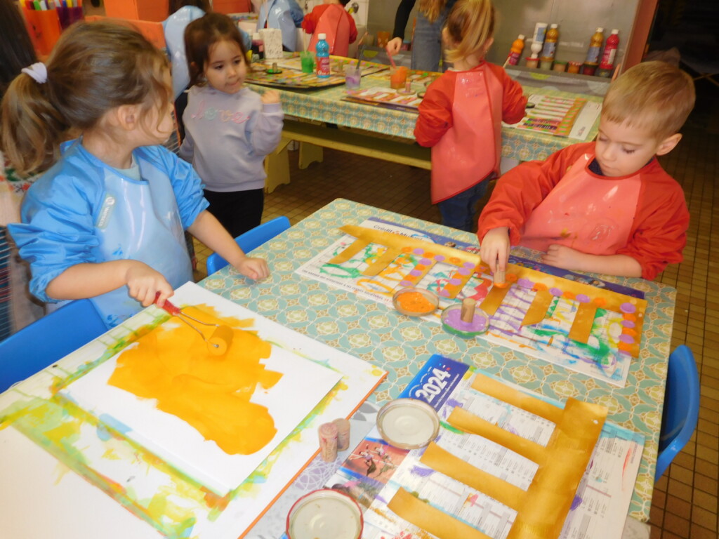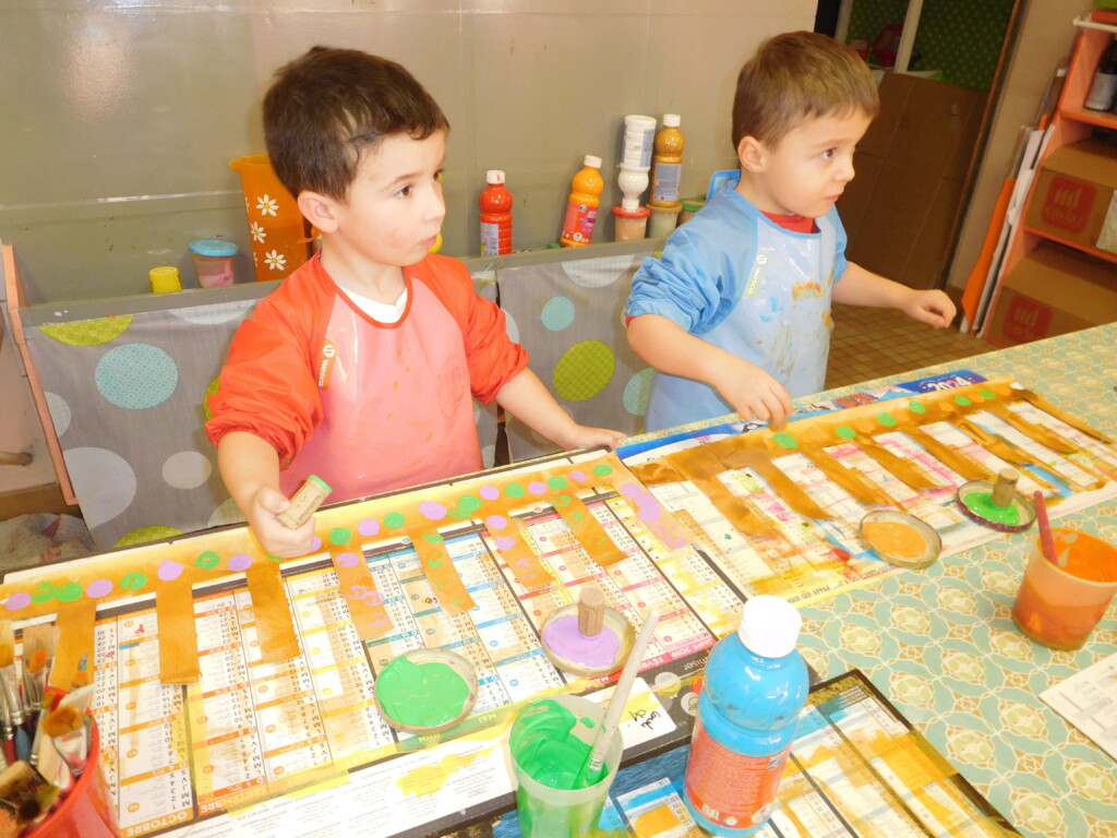 Alors nous avons peint des couronnes en papier au rouleau avec de la peinture dorée. Nous les avons agrémentées de points de algorithme faits avec des empreintes de bouchon dans de la peinture. Puis nous avons collé des “pierres précieuses” en papier crépon.