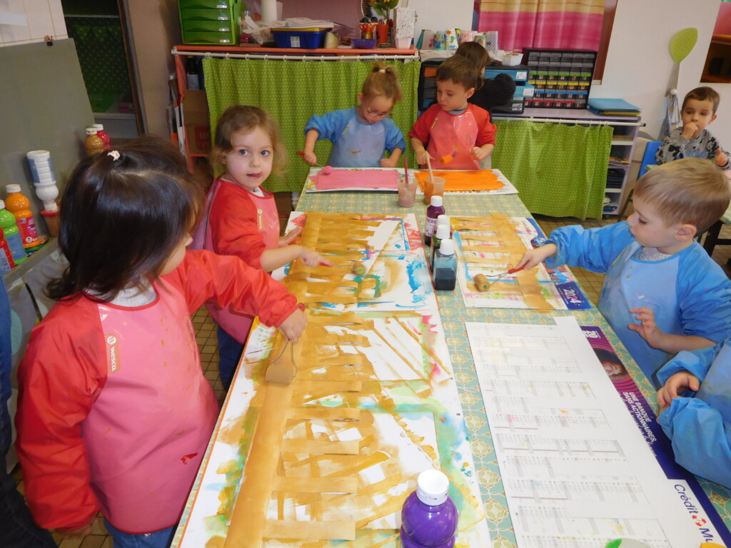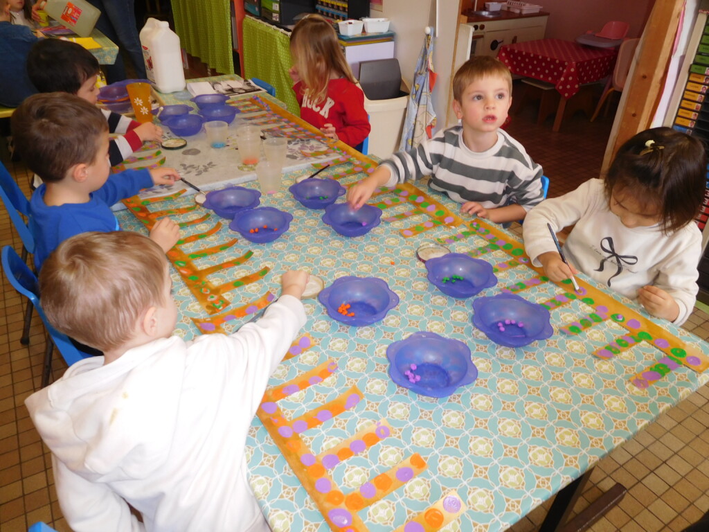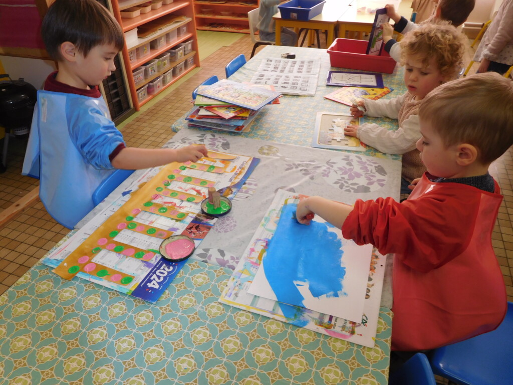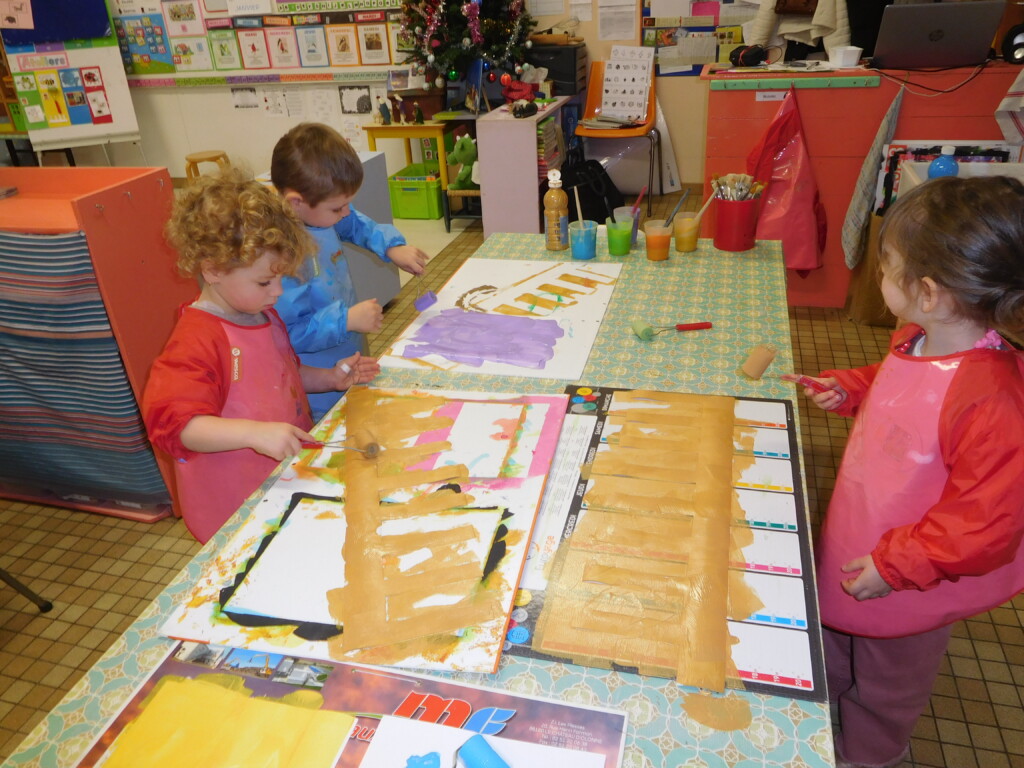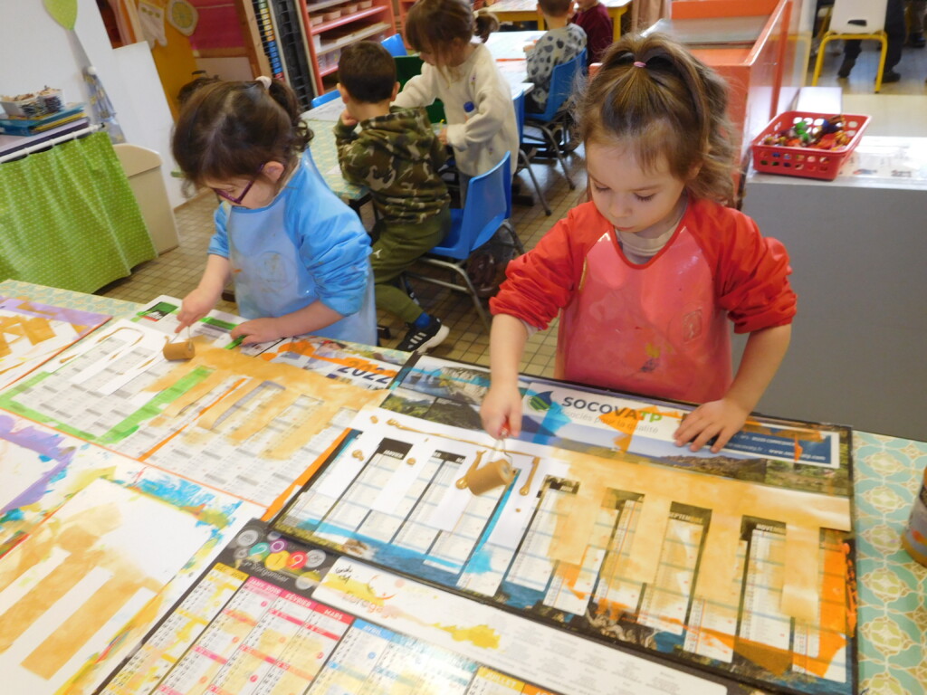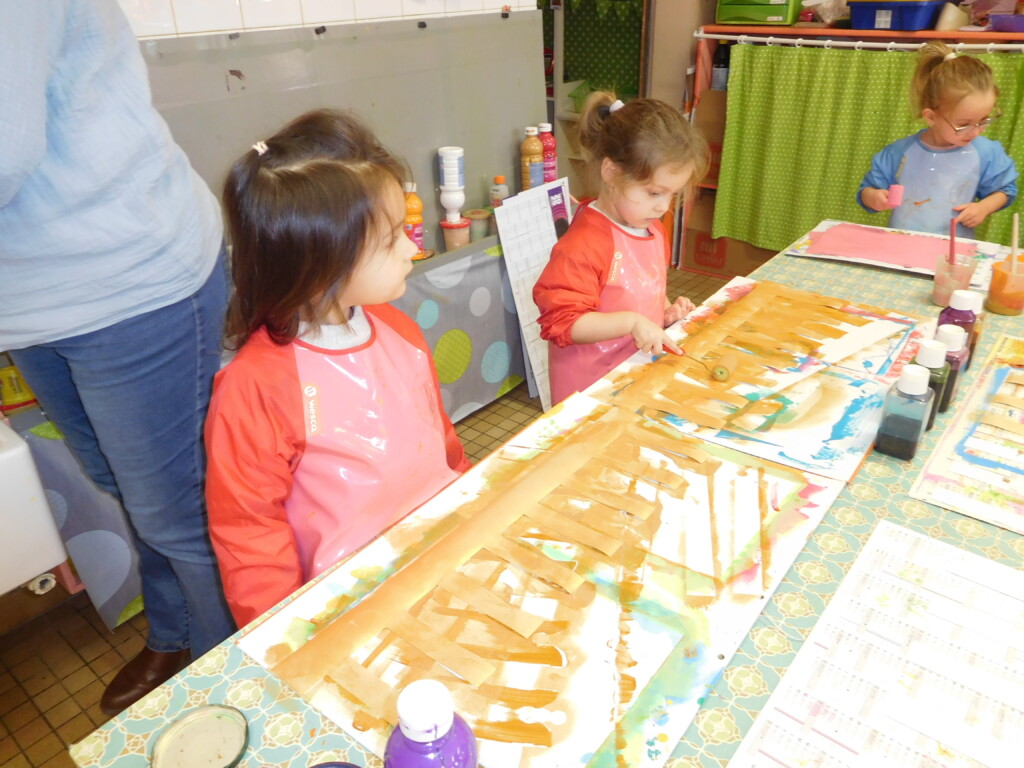 Alors nous avons peint des couronnes en papier au rouleau avec de la peinture dorée. Nous les avons agrémentées de points de algorithme faits avec des empreintes de bouchon dans de la peinture. Puis nous avons collé des “pierres précieuses” en papier crépon.