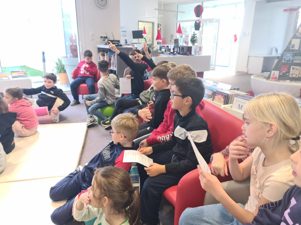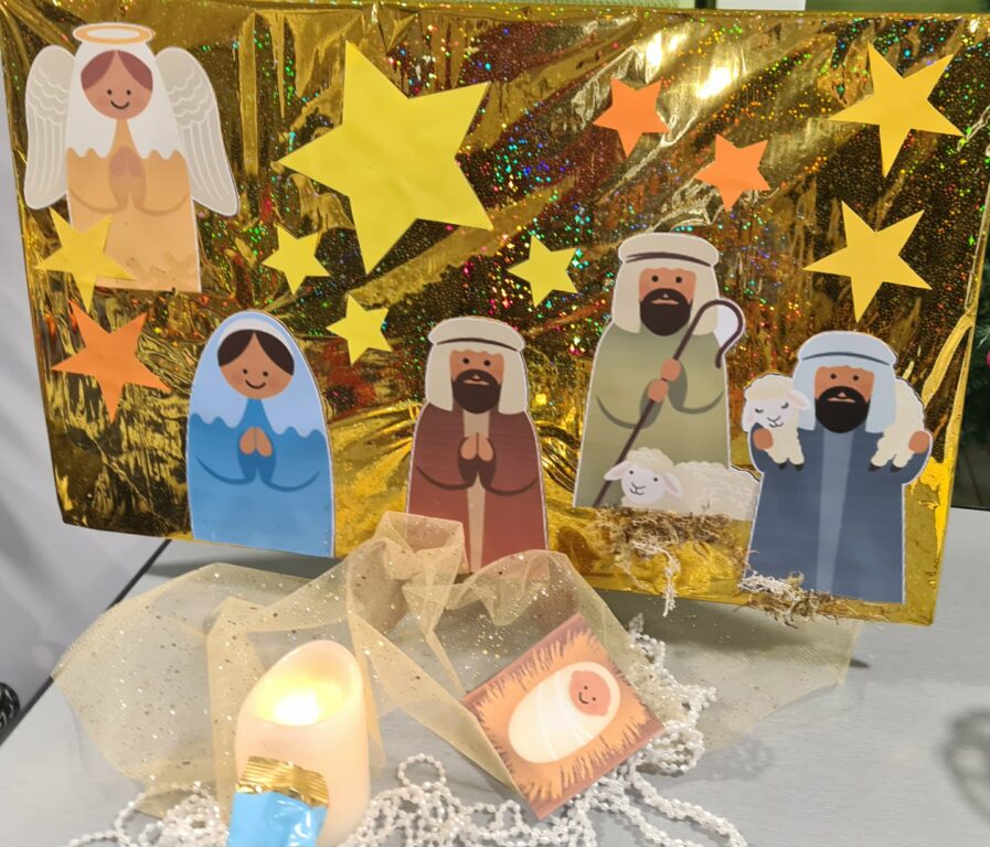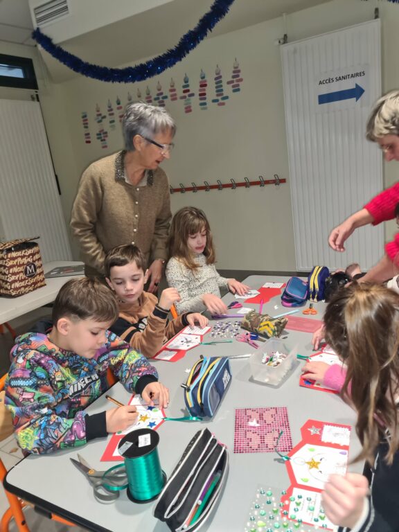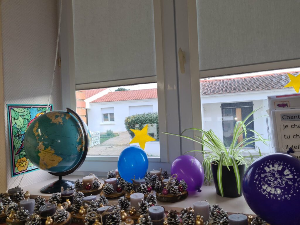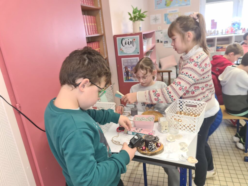 lecture de contes de Noël à la Médiathèque, préparation des bricolages, célébration de Noël avec toute l’école, temps fort à Commequiers