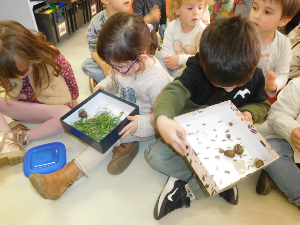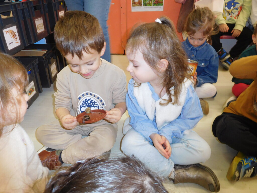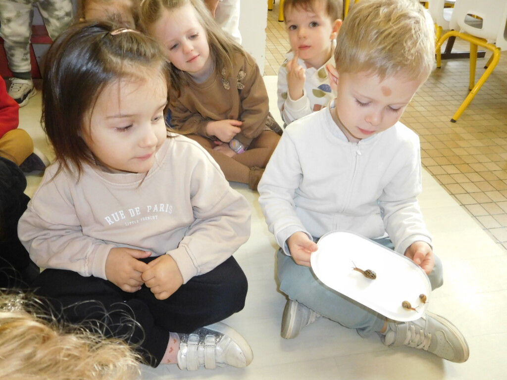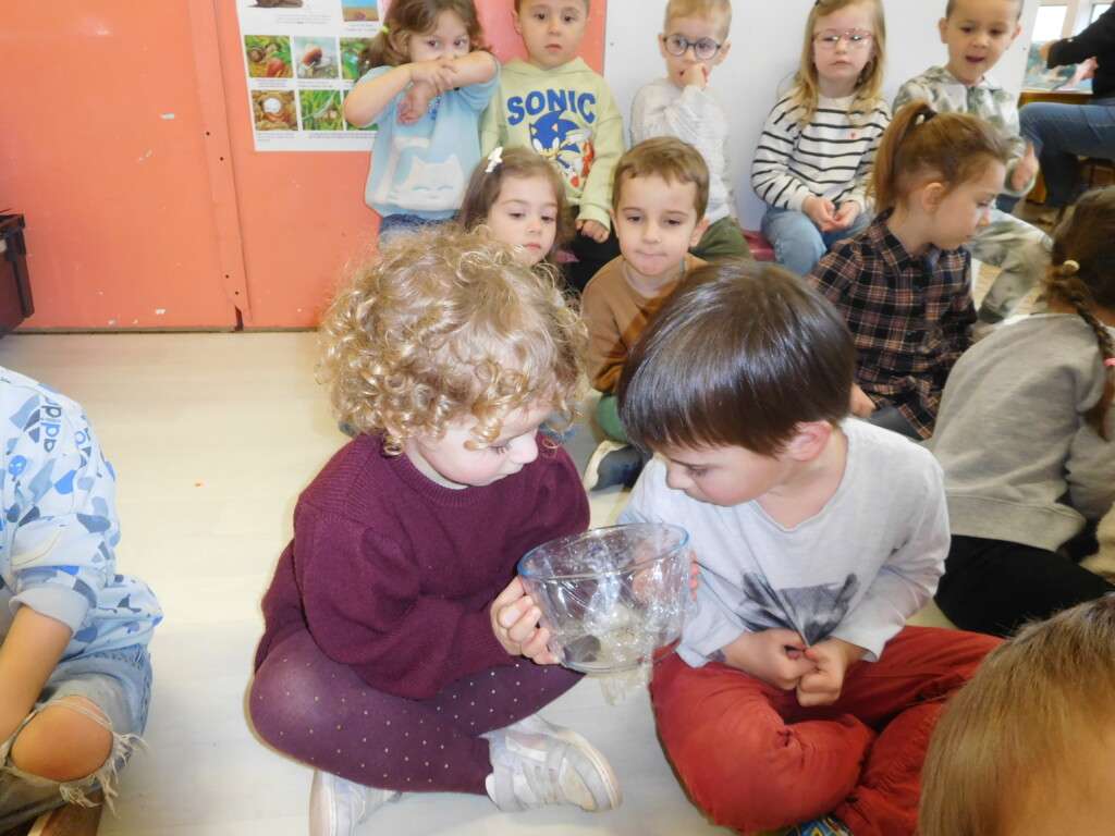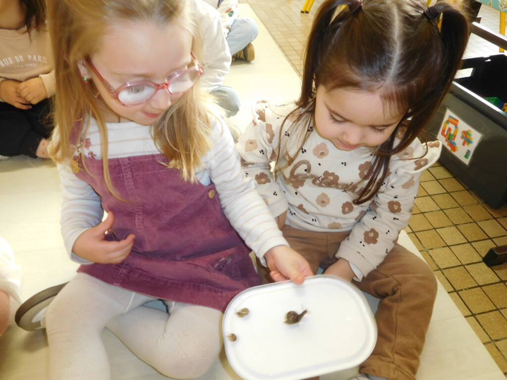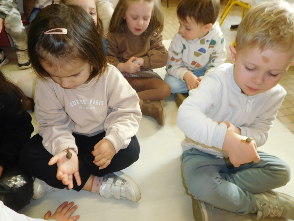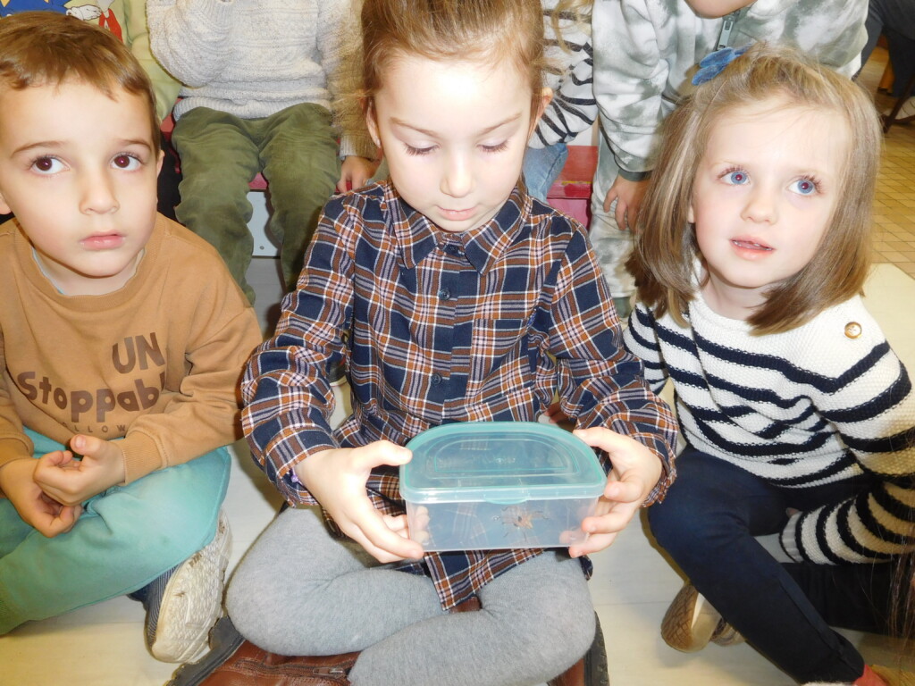 Les enfants ont apporté de nombreuses petites bêtes en classe, que nous avons pris le temps d’observer, voire de toucher ! Escargots, araignées, gendarmes, chenilles, larves de hannetons, punaises, n’ont plus de secret pour nous !