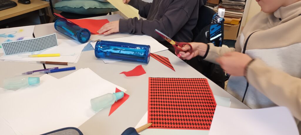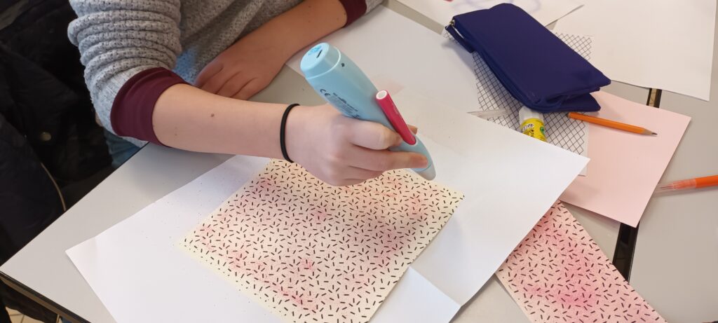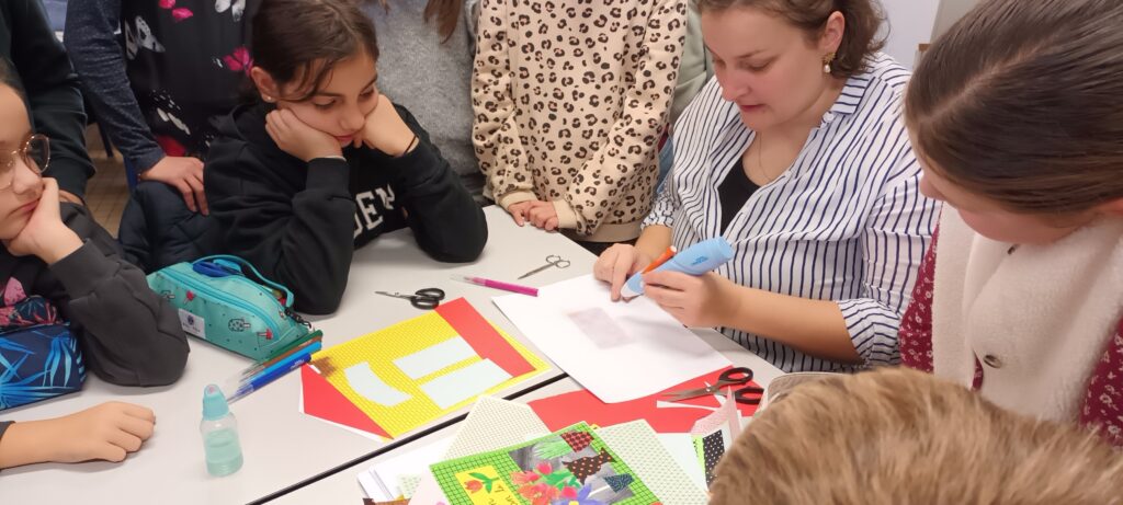 Mardi 18 novembre, Aude est revenue travailler avec nous. Cette fois-ci, elle nous a fait découvrir la technique du tampon. Chacun a créé ses tampons en gomme, avant de réaliser sa maison en respectant les éléments architecturaux (allège, soubassement, fronton, cartouche…).