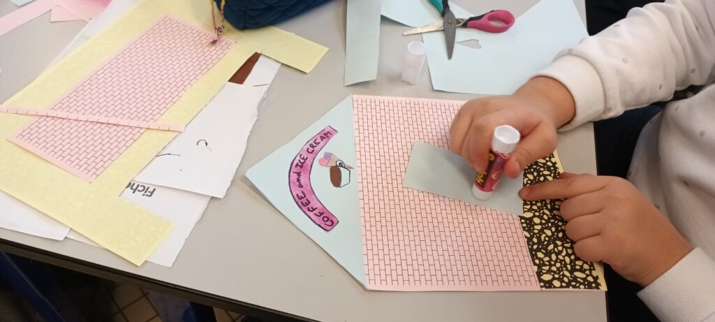 Mardi 9 décembre, nous avons travaillé pour la dernière fois avec Aude. Elle nous a demandé de réaliser des vitrines de boutiques, en respectant les codes architecturaux, en utilisant la technique du découpage/collage et de l’aérographie.